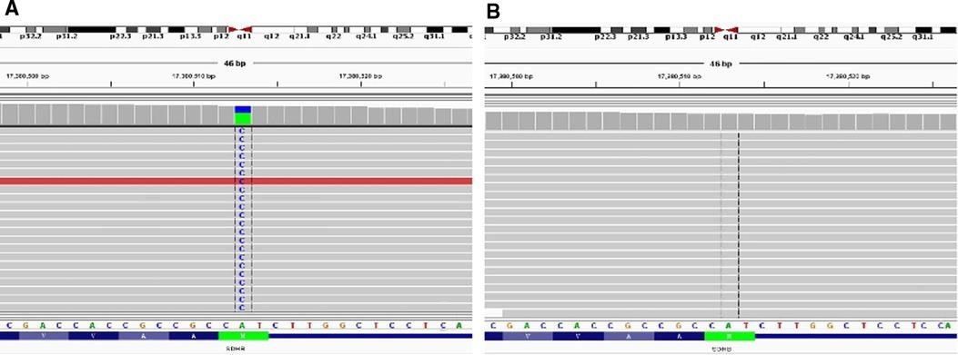 图 3:肿瘤 ( A ) 和正常 ( B ) FFPE 样本的比较。NGS检测到外显子1的SDHB基因体细胞突变(c.2 T > G, p.M1?)
