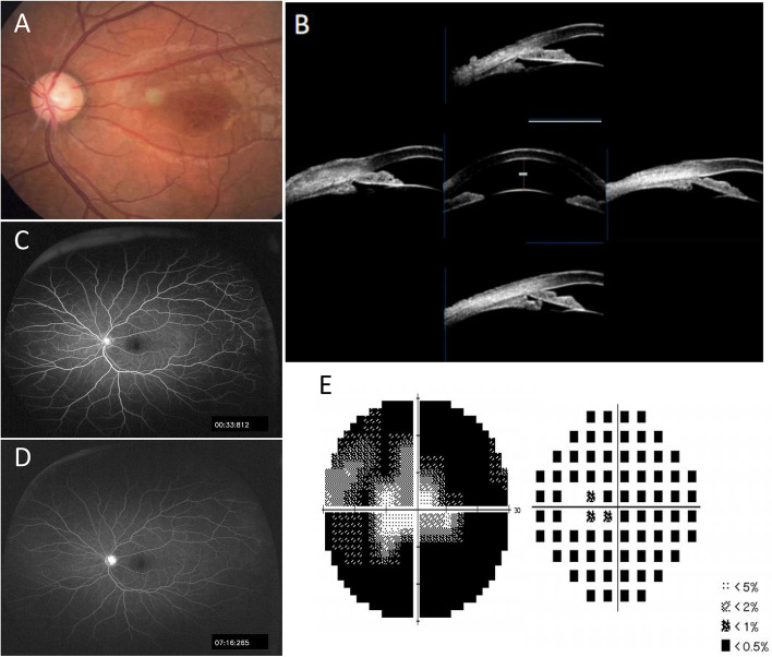 贼佳矫正视力(BCVA)右眼为0.1,左眼为0.4,屈光状态为远视(右眼+2.00/−1.00×120,左眼+2.50/−1.25×25)。眼压测量右眼为11mmHg,左眼为45mmHg。由于后囊膜混浊,右眼眼底无法清晰观察。左眼裂隙灯检查阳性结果显示轻度角膜水肿、晶状体清晰以及中央和周边前房变浅。左眼眼底检查可见黄斑区呈辐辏轮状图案以及视盘颜色苍白(图1A)。房角镜检查显示双眼房角粘连闭合。左眼超声生物显微镜(UBM)图像显示前房变浅、房角关闭以及睫状体前移和前旋(图1B)。IOL Master测量左眼前房深度(ACD)为1.55mm,眼轴长度为21.45mm。视野检查显示明显视野缺损(图1E),眼底荧光素血管造影结果正常(图1C和D)。黄斑光学相干断层扫描(OCT)显示微小囊性黄斑病变(图3D)。患者在医生建议下,自行联系佳学基因,行眼科疾病致病基因鉴定基因检测检测。根据所选项目,佳学基因采用全外显子组测序,结序结果进行基因解码分析。结果显示RS1基因第5号外子存在半合子无义突变c.489G > A(p.W163X)。对其他家庭成员进行基因检测,确认其母亲携带RS1基因相同位点的杂合突变,而其父亲和儿子均未检测到RS1基因突变(图2)。