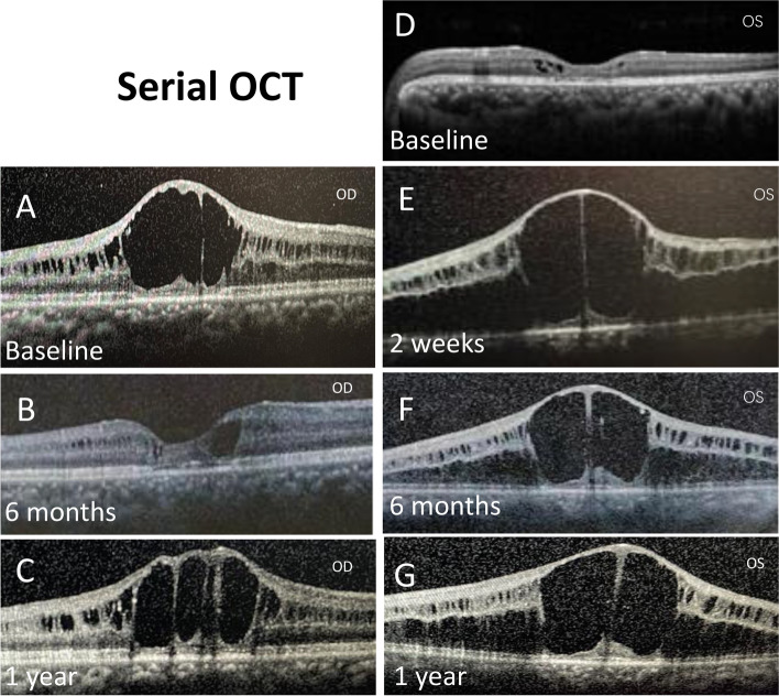 2周后,右眼行Nd:YAG激光后囊膜切开术,并对双眼进行光学相干断层扫描(OCT)。OCT显示左眼劈裂腔较术前恶化(图3E),并持续1年(图3F和G)。有趣的是,右眼在行Nd:YAG激光后囊膜切开术后6个月时黄斑囊肿消退,但在1年后再次恶化(图3A、B和C)。治疗1年后,患者贼佳矫正视力右眼为0.4,左眼为0.2。双眼前房深度稳定在3.29mm左右,眼压介于12至14mmHg之间,无需使用抗青光眼滴眼液。