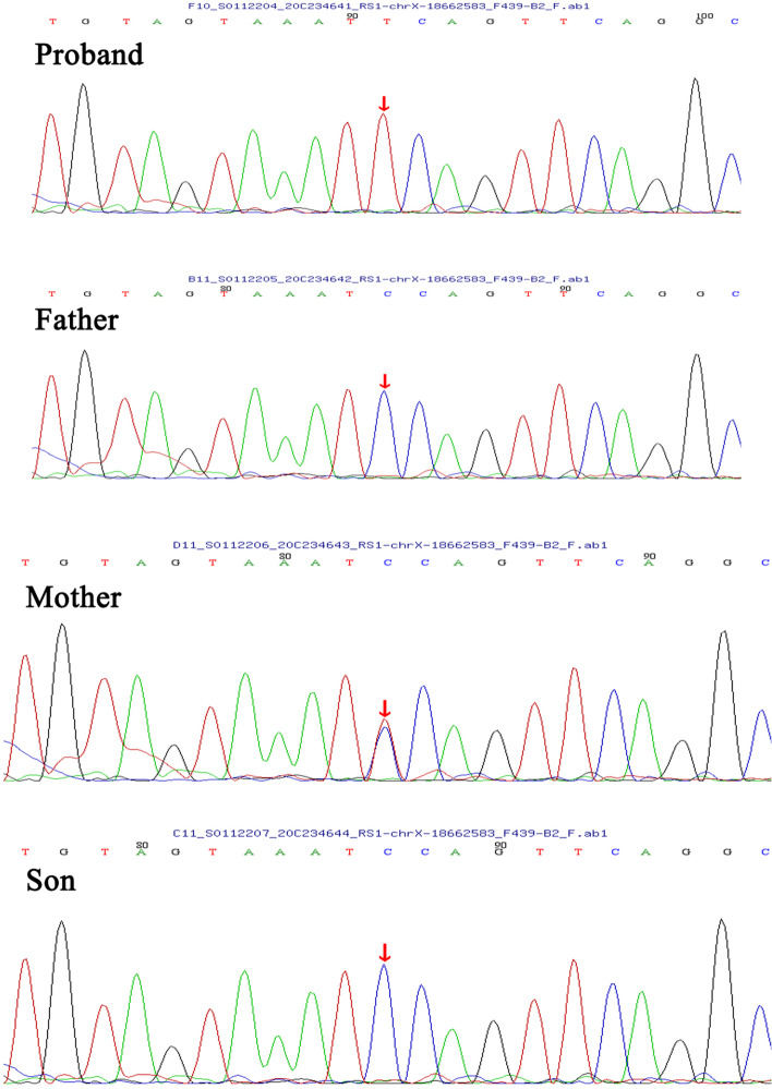 患者(先证者)为c.489G > A变异的半合子,其母亲为同一变异的杂合子。在其父亲和儿子中检测到了野生型序列。