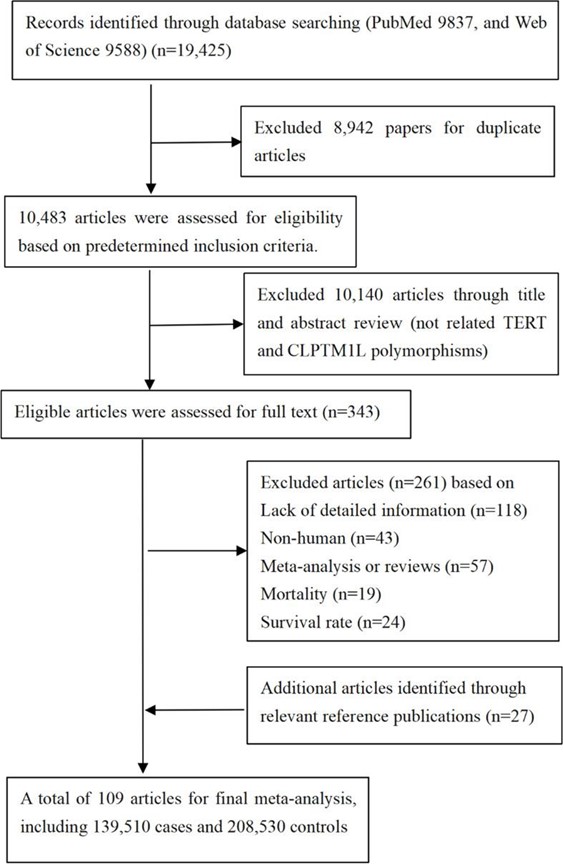 在这里,2021 年 12 月 30 日之前来自 PubMed,Web of science 和 Embase 的基因解码原始数据使用“{human telomerase revejxe transcriptase} OR {hTERT} OR {TERT} OR {CLPTM1L} OR {cleft and palate transmembrane 1 like} OR {TERT -CLPTM1L 区域} OR {5p15.33}”,并确定了 19,425 次引用。除此之外,还通过检查出版物的相关参考文献(评论,荟萃分析研究等)收集了其他文章。最后,109篇基因解码原始数据被纳入癌症风险早知道难点攻关课题组的研究(图1)。