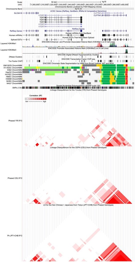 图 2:来自 DNA 元素百科全书 (ENCODE) 数据的证据,用于使用 UCSC 基因组浏览器对 5p15.33 中基因突变的调节功能。该图表示以TERT-CLPTM1L为中心的 50 kb 窗口内的 5p15.33基因区。每个图中的轨迹(从上到下)是基因组碱基位置,染色体条带,UCSC 基因,来自 GenBank 的人类信使 RNA,已剪接的人类表达序列标签 (EST),ENCODE 增强子和启动子相关组蛋白标记(H3K4Me1) 在 8 个细胞系上,在 9 个细胞系上编码启动子相关组蛋白标记 (H3K4Me3),编码数字 DNaseI 超敏反应簇,编码转录因子 ChIP-seq,通过 Broad Institute 的隐藏马尔可夫模型 (HMM) 编码染色质状态分割 (亮红色,活性启动子;浅红色,弱启动子;紫色,无活性/平衡启动子;橙色,强增强子;黄色,弱/平衡增强子;蓝色,绝缘体;深绿色,转录转变/延伸;浅绿色,弱转录;灰色, polycomb-repressed; 浅灰色, 异染色质/低信号/重复/拷贝数变异),单核苷酸多态性(dbSNP build 130),约鲁巴人(YRI)的分期基因型连锁不平衡,CEPH(CEU)分期基因型的连锁不平衡和汉族的LD Phased Genotypes 中来自东京的中文 + 日文 (JPT+CHB)。