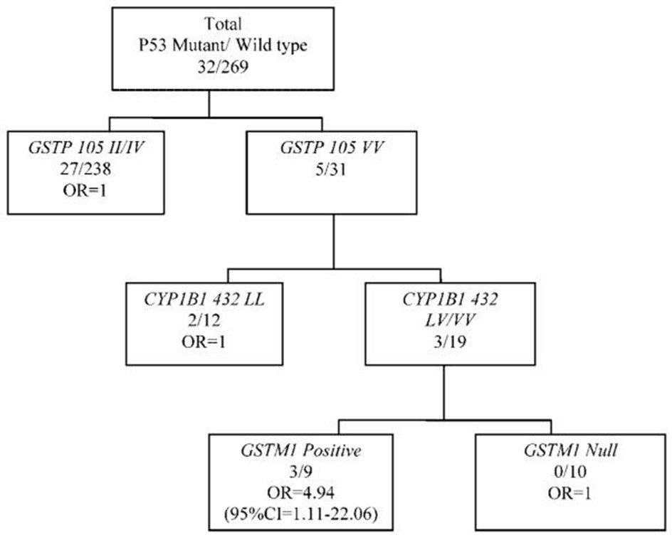 检查个体基因型并没有产生与p53突变的统计学显着关联。图1使用 MARS-logit 技术对基因-基因相互作用对突变的影响进行了探索性分析。在这项试点研究中,基因检测与改变生活习惯预防肿瘤发生特别行动小组只使用了来自白种人的数据,因为当包含来自非裔美国人的数据时,显着的相互作用消失了。这些结果表明GSTP1 105 VV、CYP1B1 432 LV/VV 和GSTM1阳性基因型的组合基因型与p53突变相关[OR = 4.94; 95% CI = 1.11–22.06] 与具有其他基因型模式的女性相比。由于样本量很小,有必要在更大的研究中确认这些相互作用,但它支持在确定多态性对突变的影响时检查基因型组合的重要性。