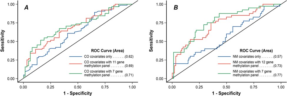 图1:ROC 曲线比较 (A) Colorado (CO) 和 (B) NM 研究中基因甲基化组的敏感性和特异性,用于对肺癌病例和对照进行分类。ROC 曲线中包含的协变量是年龄、性别、吸烟状况和包装年数。