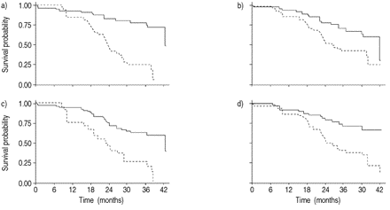 图 2:生存曲线: a) p53 突变 (-ve, n=54; +ve, n=48); b) p53 蛋白表达(-ve,n=47;+ve,n=55);c) p53抗体(-ve,n=77;+ve,n=25);d) bcl-2 蛋白表达 (-ve, n=53; +ve, n=49) 测试。-: 阴性; +: 阳性。对数秩检验:a、c 和 d 的 p<0.001,b 的 p=0.008。