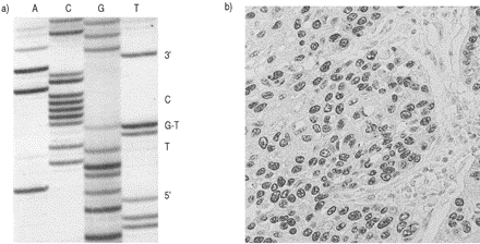 图1:a)通过直接测序确定的突变 p53(外显子 5,密码子 176,Cys-Phe)基因的核苷酸序列(A:腺嘌呤;C:胞嘧啶;G:鸟嘌呤;T:胸腺嘧啶)。b) 通过免疫组织化学分析确定在鳞状细胞癌 IIIa 期中 p53 蛋白的过表达。