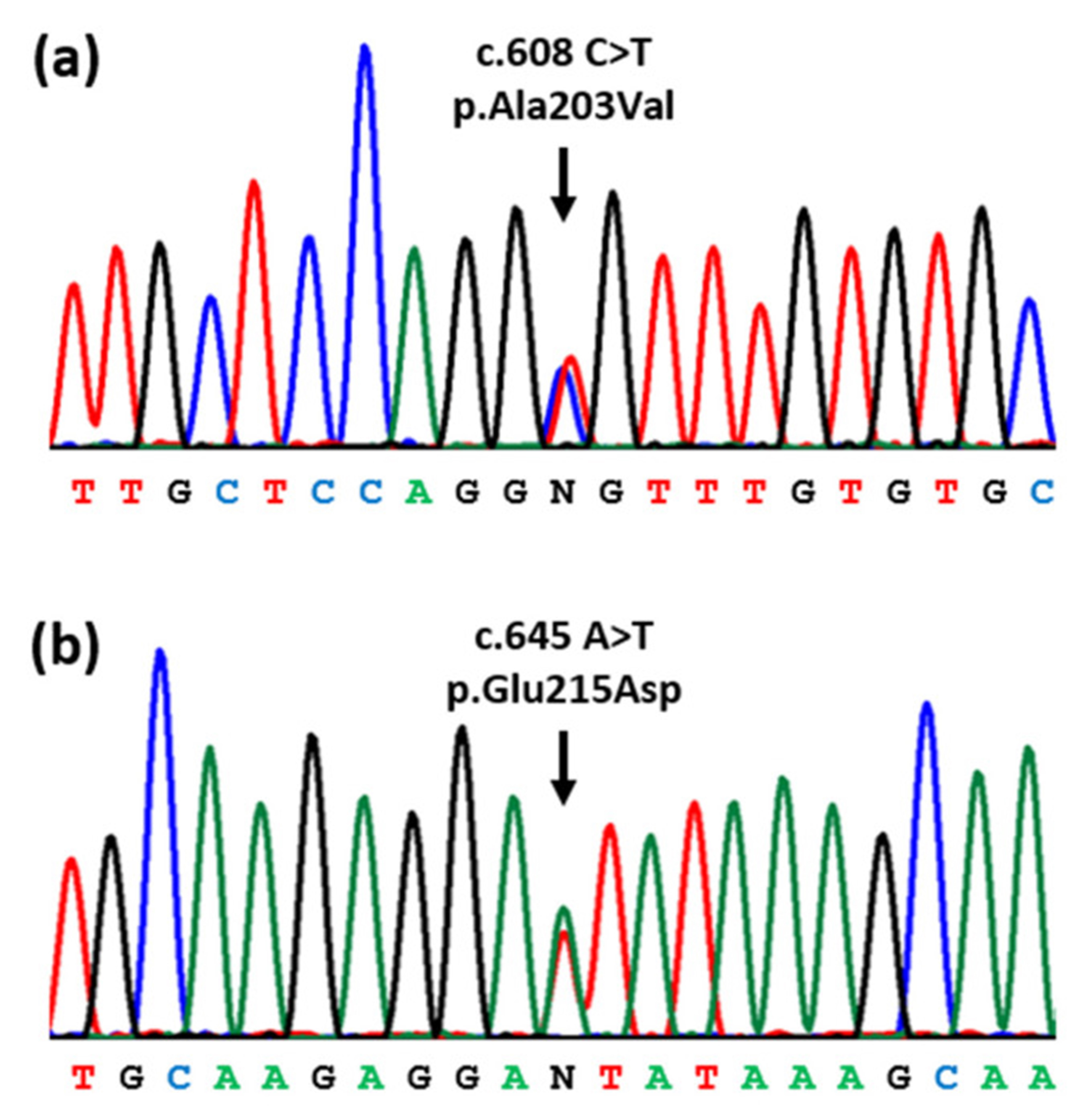 图1:17-β-羟基类固醇脱氢酶 3 ( HSD17B3 ) 基因的部分 DNA 序列。发现该患者是外显子 9 中两个错义突变(箭头)的复合杂合子:( a ) NM_000197.2 :c.608C>T, p.Ala203Val;( b ) NM_000197.2:c.645A>T,p.Glu215Asp。