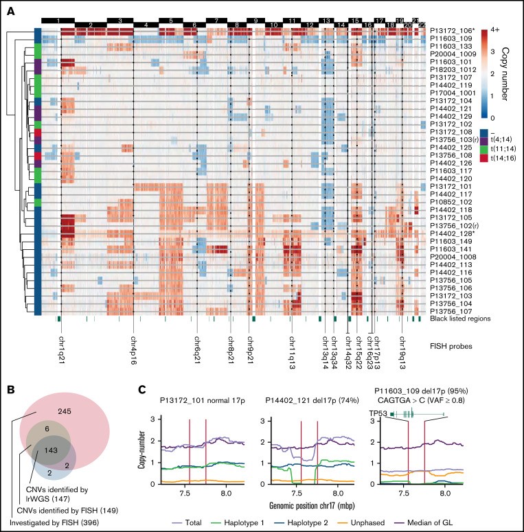 图 2:lrWGS 允许可靠地检测 CNV 和识别双重打击多发性骨髓瘤。(A) 热图显示根据 lrWGS 覆盖范围计算的体细胞染色体 (chr1-22) 的拷贝数。拷贝数在两种情况下(由 * 表示)更正为 chr4 拷贝数(补充方法)。垂直黑线表示 FISH 探针的基因组定位。FISH 研究的区域用黑点表示,点在灰线上方或下方的位置分别表示拷贝数增加或减少。(B) 维恩图显示 FISH 调用的 CNV 和 FISH 面板中包含的区域(不包括 IGH 区域)中的 lrWGS 调用的 CNV 之间的重叠。FISH 调查的区域显示在面板 A 中。(C) TP53 基因座周围区域中总的、单倍型特定的和未定相的 lrWGS 覆盖范围的拷贝数。显示正常对照样本(种系 [GL])中的中值拷贝数以供比较。垂直线表示用于识别 chr17p CNV 的 FISH 探针的边界。对于 P11603_109,指示了获得的 TP53 突变(使用 lrWGS 数据检测)的位置。VAF,变异等位基因频率。