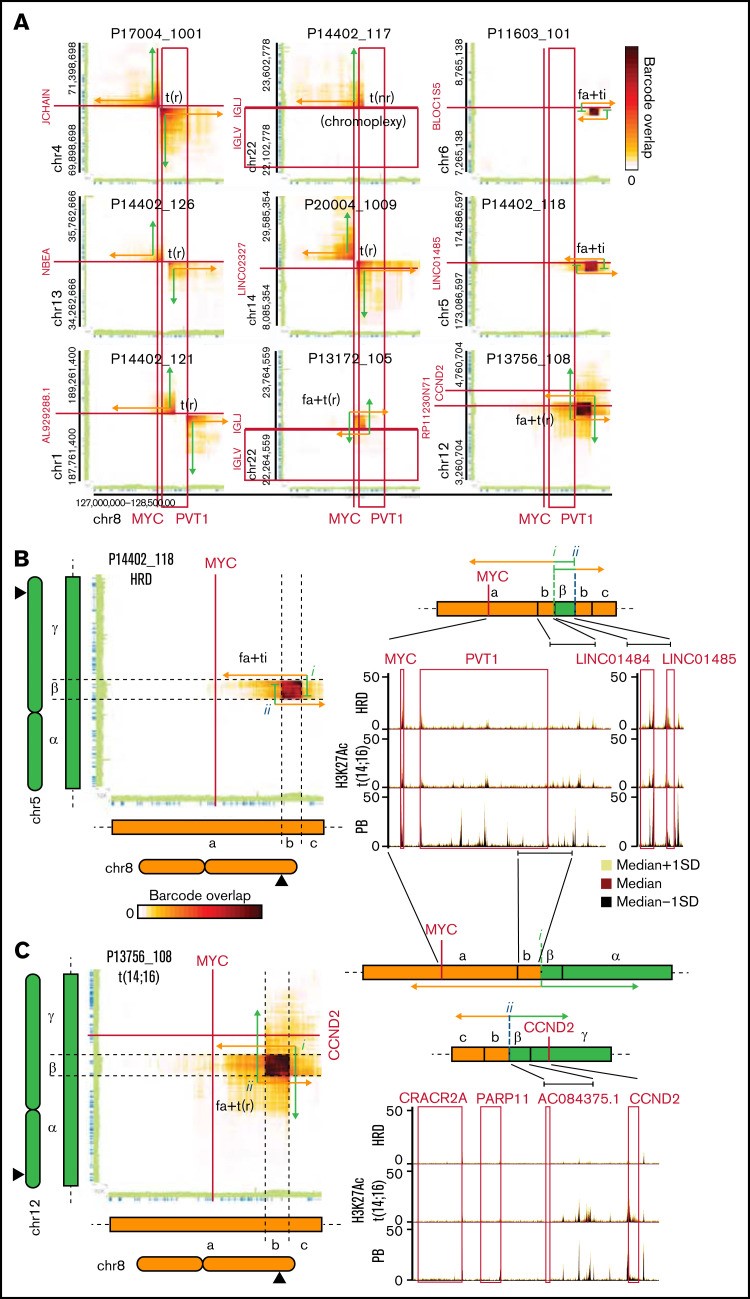 图 5:lrWGS 可以识别影响 MYC 基因座的各种 SV。(A) 热图显示 MYC 基因座和指示的基因组位置之间共享的读取云的数量。显示了来自检测到影响基因组 MYC 区域的结构性变异(SV)的患者 (n = 9) 的数据。连接的绿色和橙色箭头示意性地表示结构性变异(SV)连接的区域。SV 的类型显示在读取云簇旁边。图 3 提供了有关读取云模式解释的详细信息。如果所描绘的结构性变异(SV)是更复杂结构性变异(SV)的一部分,则会指出这一点。(BC) P14402_118 (B) 中 chr8 和 chr5 或 P13756_108 (C) 中 chr12 上的 MYC 基因座之间的读取云重叠。在面板 BC 中,指出了用于解析衍生基因座结构的特征 (i-ii);右侧显示了衍生染色体区域的示意图;和轨迹显示指定多发性骨髓瘤亚型和浆母细胞 (PB) 中涉及区域的 H3K27Ac 信号(中值±标准偏差 [SD])。fa+ti,在局灶性放大中发生的模板化插入;fa+t(r),局灶性放大中发生的相互易位;t(nr),单向易位;t(r),相互易位。