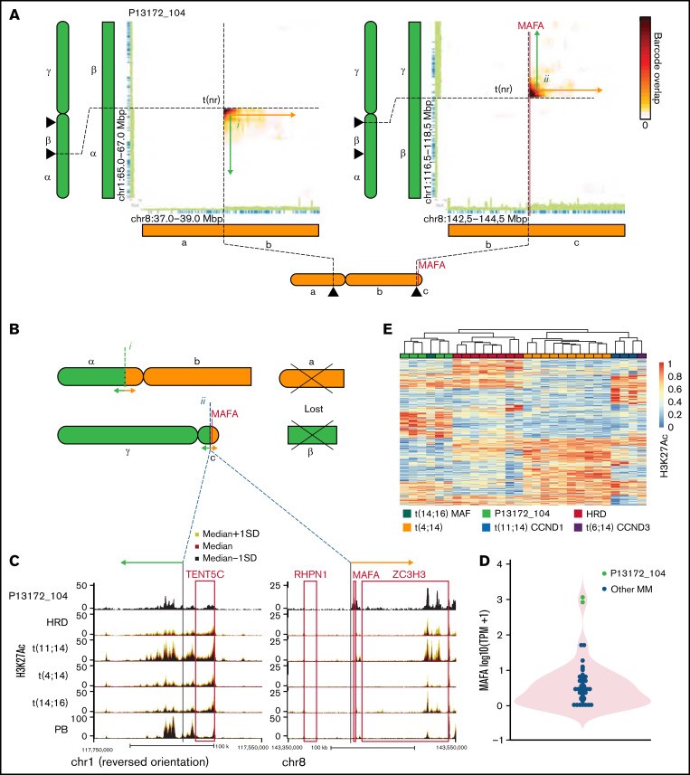 利用对 lrWGS 数据中的遗传畸变进行整体分析的可能性,多发性骨髓瘤的深度基因检测及大数据分析确定了与不良结果相关的复发性和个体物异性事件,这些事件在当前的临床常规遗传学中不能被基于数据库比对的基因检测发现。在复发性变异中,多发性骨髓瘤的深度基因检测及大数据分析发现了 t(8;22) MYC-IGL 易位、高风险双重打击 TP53 失活和最近与不良结果相关的染色体碎裂的病例。有趣的是,多发性骨髓瘤的深度基因检测及大数据分析还可以发现导致基因过度表达的个体独特性结构变异,这些基因先前被证明是 IGH 基因座的易位伴侣(MAP3K14和MAFA)。特别是,涉及 MAFA 基因的 t(1;8) 是值得注意的,因为该结构变异可能代表一个替代的主要事件,其分子等同于具有相似患者风险特征和先天性的MAF的 t(14;16) 放松管制对蛋白酶体抑制剂的抗性。此外,多发性骨髓瘤的深度基因检测及大数据分析发现具有 t(11;14) 的样本通常携带 3'RR 和 CCND1 区域的重复。所分析的 t(11;14)多发性骨髓瘤是随机包含的事实表明这是一种相当普遍的现象,在复杂结构性变异(SV)插入期中有和没有衍生 t(11;14) 染色体参与的情况下都可以发现这种现象