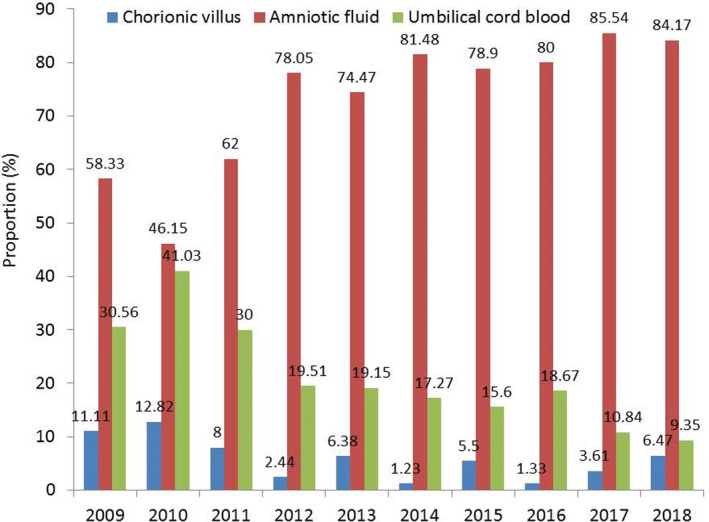 图1:2009 年至 2018 年中国东南部福建省地中海贫血携带者的产前绒毛、羊水和脐带血样本比例