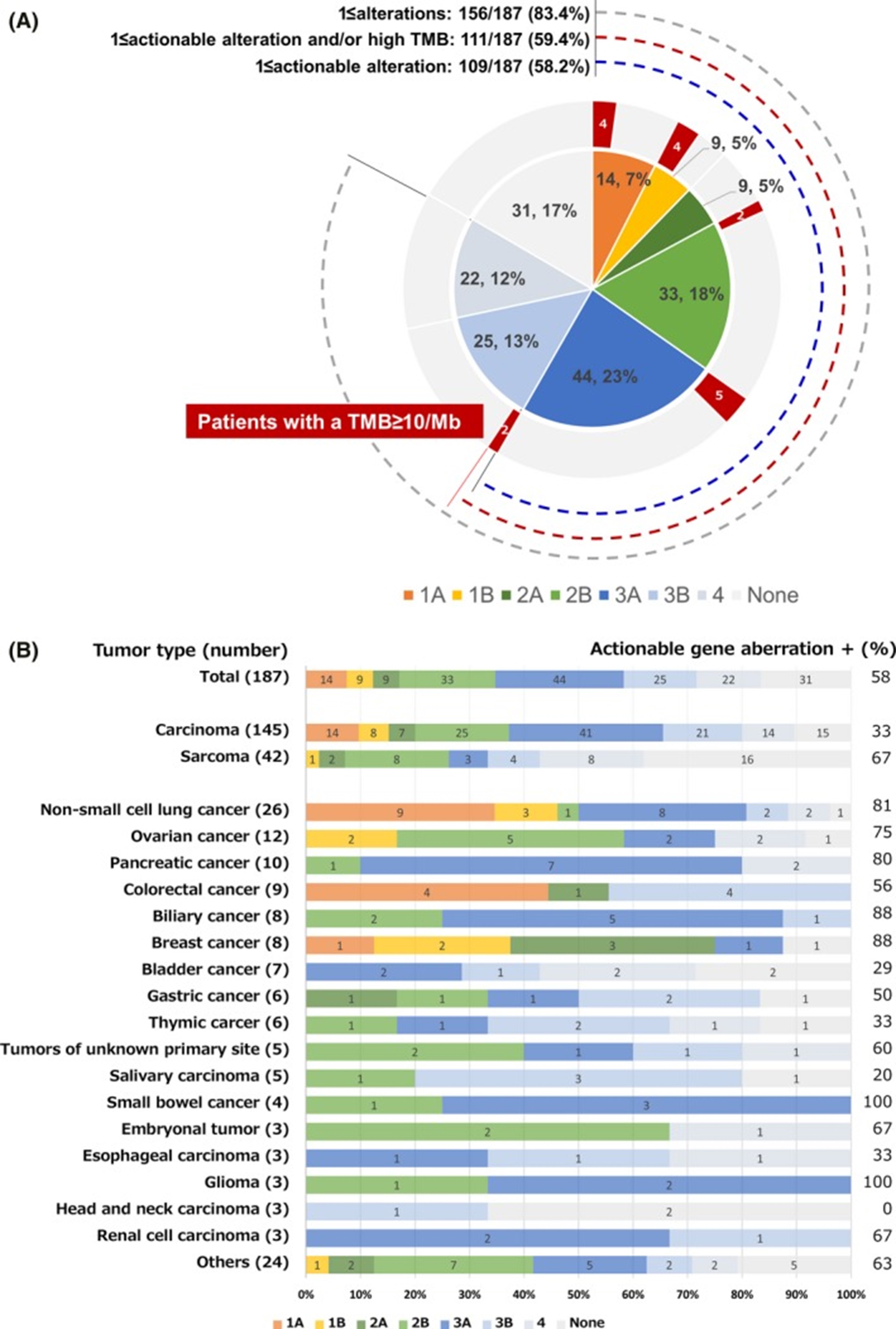 NCC Oncopanel 测试导致 25 例(13.4%)根据可操作的基因畸变进行药物治疗。其中包括 7 例青少年和年轻成人(15-39 岁)和罕见癌症(表