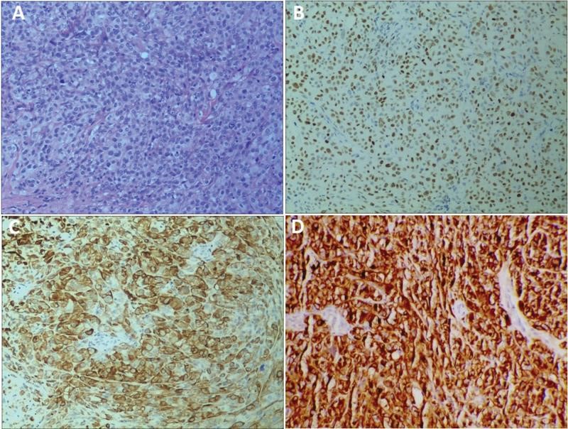 图 2:免疫组化结果。A:H&E染色显示肿瘤细胞呈弥漫性均匀斑片状分布,细胞质丰富,排列成大小不等的巢状(100×)。B:免疫组织化学显示 P40 的弥漫性表达(100×)。C:免疫组织化学显示 CK5/6 的弥漫性表达(400×)。D:通过肿瘤比例评分(肿瘤阳性细胞数)确定的PD-L1蛋白表达为90%。