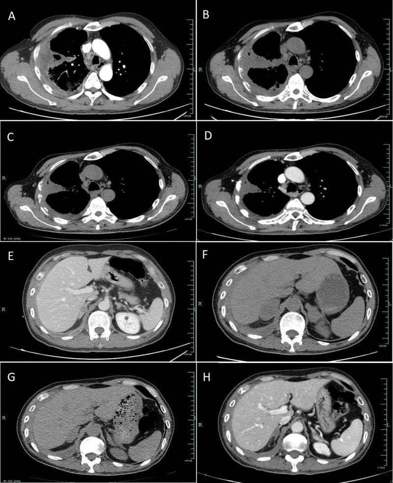 图 3:EGFR-TKI 和 pembrolizumab 单药治疗期间 CT 上肺部 (AD) 和双侧肾上腺 (EH) 病变的变化。A/E:预处理。B/F:EGFR-TKI靶向治疗2个月。C/G:派姆单抗单药治疗 1 个周期。D/H:派姆单抗单药治疗 5 个周期。