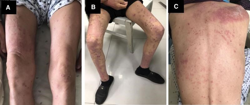 图 4:帕博利珠单抗单药治疗后皮疹的状况。A:ICI单药治疗5个周期后,患者腿部出现1级斑丘疹。B/C:皮疹加重至 3 级,并在一周后蔓延到他几乎所有的腿和背部。