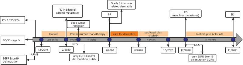 埃克替尼于2019年11月12日作为一线靶向治疗给药。此外,患者接受了右侧肩胛骨的姑息性放疗。两个月后,胸部CT显示肺部肿块无明显变化,胸膜增厚,淋巴结肿大,但双侧肾上腺转移灶有明显进展。采用患者血浆进行了包括9个基因的下一代测序基因测试,以排除共存基因突变。结果证实EGFR外显子19缺失是唯一的基因突变,丰度分数为2.06%。经过2个月的靶向治疗,患者出现严重疲劳,体重减轻4公斤。然后肺癌靶向用药指导基因检测选择 pembrolizumab 单药治疗作为二线治疗,剂量为每 3 周 100 mg。服用 1 剂派姆单抗后,患者随后又接受了 4 个周期的派姆单抗治疗。根据实体瘤反应评估标准1.1版,胸部和肾上腺的病变显著减少,导致部分缓解(PR)(图3)。然而,经过 5 个周期的免疫检查点治疗后,他的腿上出现了以斑疹和丘疹为特征的皮疹,覆盖了不到 10% 的体表面积(图 4A)。根据国家综合癌症网络关于免疫检查点抑制剂相关毒性的指南,这被确定为 1 级,并在受影响的区域应用了局部类固醇。然而,他的皮肤状况继续恶化,一周后斑丘疹变得更加严重,并蔓延到他几乎所有的腿、背部和部分胸部(图 4B,C)。它现在覆盖了他身体的 30% 以上,因此被归类为 3 级。皮疹以 1 mg/kg/d 的剂量用强的松治疗。最初,皮疹略有减少,但即使剂量加倍,药物也很快变得无效。患者随后因皮疹到另一家医院接受中药治疗,ICI治疗暂停。皮疹得到控制后,他接受了 4 个周期的紫杉醇(白蛋白结合)加顺铂化疗。2020年12月出现肝转移后再次采集血浆进行基因检测,结果仍显示除EGFR外显子19缺失突变(丰度为0.27%)外无其他致癌改变。然后,医生为他使用了埃克替尼加安罗替尼(一种口服小分子酪氨酸激酶抑制剂 VEGFR、PDGFR、FGFR、c-Kit 和 Met)。迄今为止,他已经服用了十一个月的联合靶向药物。该患者的治疗时间表如图所示图5.