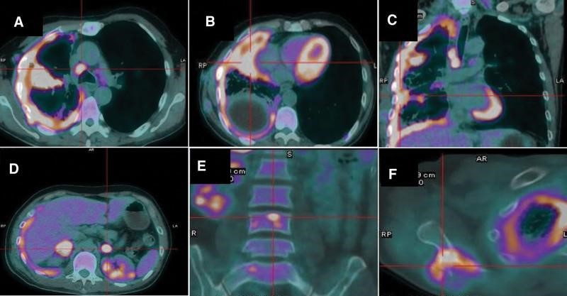 图1:PET-CT扫描。PET-CT显示右肺肿块糖代谢异常增加,纵隔淋巴结肿大,右侧胸膜弥漫性增厚。此外,还发现了双侧肾上腺、右侧肩胛骨和多处椎骨的全身转移。