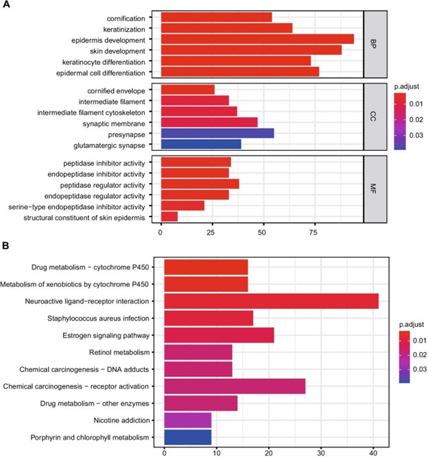 DEGs的生物学功能和途径可以通过基因富集分析来研究。表皮发育、皮肤发育、表皮细胞分化、角质形成细胞分化和角质化是GO 中丰富的生物过程(前 5 位)。前突触、突触膜、谷氨酸能突触和角质化细胞分化及角质化是通过 GO分析得到的主要成分(前 5 位)。肽酶调节剂活性、内肽酶调节剂活性、内肽酶抑制剂活性、肽酶抑制剂活性和丝氨酸型内肽酶抑制剂活性是GO的前五种分子功能(图 2A)。类似地,神经活性配体-受体相互作用、化学致癌-受体激活、雌激素信号通路、金黄色葡萄球菌感染和药物代谢-细胞色素P450是前5个显着富集的通路(图2B)。