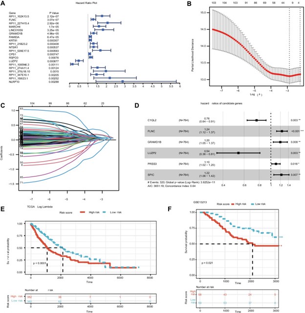 图 3:在 TCGA 队列中构建风险特征。差异表达基因的单变量 Cox 分析。(B) 在 LASSO 回归中调整参数选择的交叉验证。C差异表达基因的 LASSO 回归。D差异表达基因的多变量 Cox 分析。TCGA中非小细胞肺癌患者风险预后模型的E - F K-M生存分析