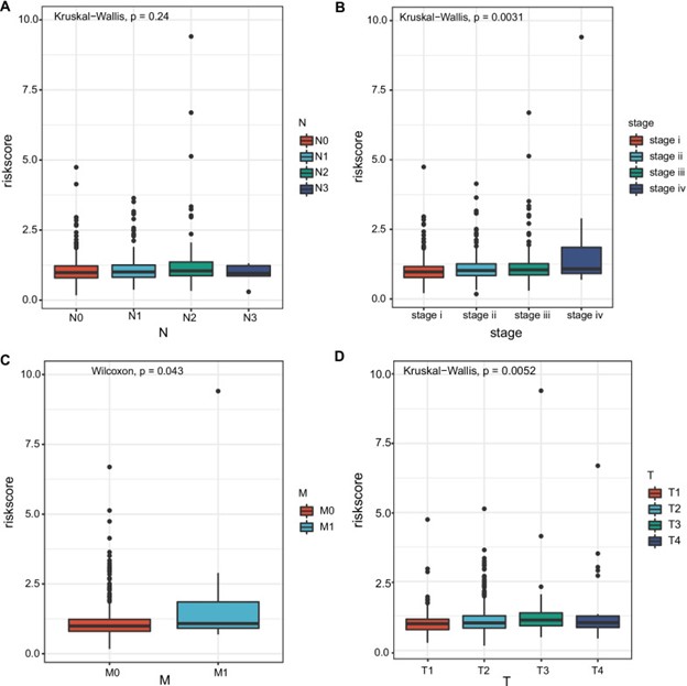 图 5:预后风险模型与临床病理特征(分期,TNM)之间的相关性A – D