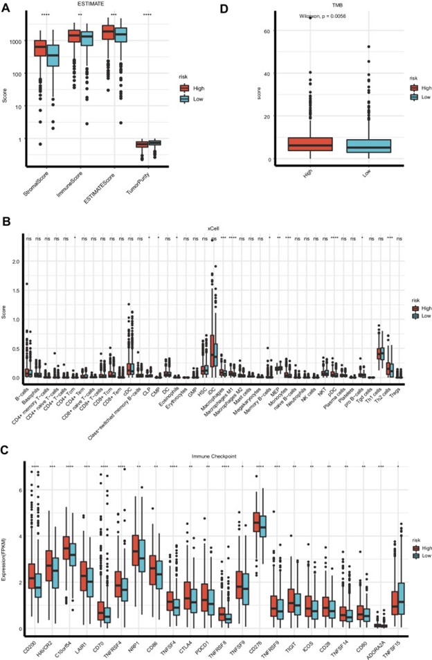 图 6:非小细胞肺癌患者免疫微环境与风险评分模型关系分析。对高风险和低风险群体的估计分析。B免疫浸润细胞的分析。C高风险和低风险人群免疫检查点的分子分析。D高危组和低危组的 肿瘤突变负荷(TMB) 评分