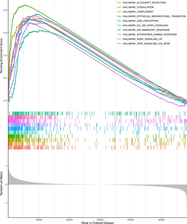进行GSEA分析以进一步探索低风险和高风险人群之间的差异生物学机制。我们发现了信号通路(图 7),包括同种异体移植排斥、凝血、补体、上皮间质转化、G2M 检查点、IL6-JAK-STAT3 信号传导、炎症反应、干扰素 γ 反应、KRAS 信号传导、通过 NFkB 的 TNFA 信号传导在高危组中显着富集。