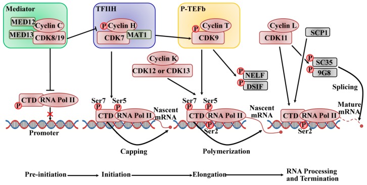 图 2:CDK/cyclin 复合物调节基于 RNAPII 的转录周期的预起始、起始、延伸和终止((2020 Mar 13. doi: 10.3390/ijms21061960)