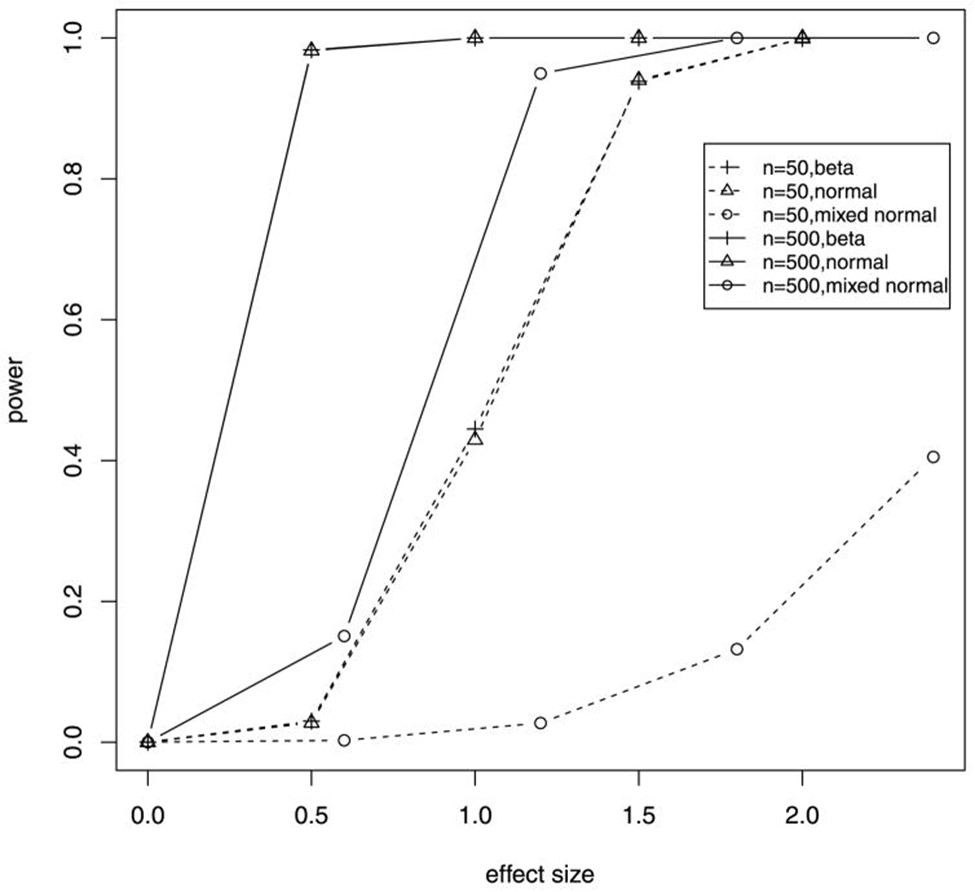 甲基化测序与新一代测序技术应用拓展重大课题组接下来在H A下进行了模拟以研究所提出的检验的功效,假设病例和对照中的甲基化水平来自具有不同平均值的分布。图 3显示了三种模拟场景在α = 0.0001 时评估的功率曲线。在图中,效应大小由 Cohen's d表示,并计算为平均差除以模拟中设置的标准偏差。如这些图所示,所提出的检验的功效随着效果的大小而迅速增加。对比三种模拟场景,场景(a)和场景(b)的功率曲线几乎相同,而场景(c)的功率与场景(a)和(b)相比有所降低。