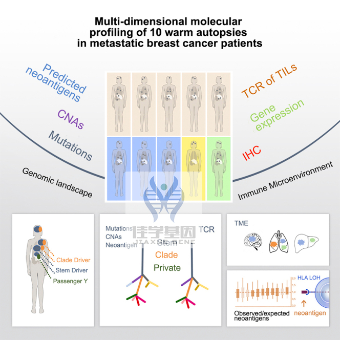 然而,乳腺癌的基因解码开始多重疗法耐药性乳腺癌的多个转移灶进行全面的分子分析,包括对恶性病灶、TME区域和TCR库的检查,这是一咱系统性基因解码。佳学基因肿瘤基因解码在此分享对10例致命多重耐药性乳腺癌患者的温尸检中多个个体转移灶进行了广泛的多平台分子分析,包括DNA测序、RNA测序、TCR测序、H&E切片数字病理学和免疫组织化学。通过这一基因解码,佳学基因检测能够表征个体转移灶中的突变和拷贝数变异(CNA)情况,推断其克隆祖先,评估各转移灶中的TME特征,识别预测的新抗原,并分析转移灶中的TCR库,从而为经历多种全身疗法的致命乳腺癌提供详细的分子特征。
