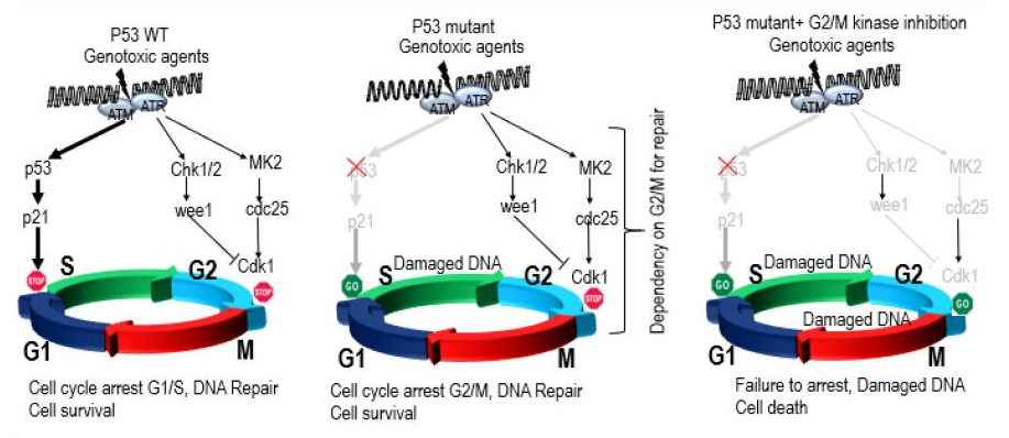 如何寻代针对TP53突变的靶向药物呢?探索新靶点的一种方法是找到具有P53失调癌细胞的脆弱性。与野生型P53癌细胞相比,可以选择性地杀死P53失调癌细胞或抑制P53缺陷细胞的生长。P53缺陷癌细胞中G1/S细胞周期检查点的缺失使得它们完全依赖G2/M检查点来维持基因组完整性。这种依赖性暴露了P53缺陷癌细胞的独特脆弱性,导致P53与多种基因/途径之间的合成致死关系。P53缺陷癌细胞表现出与电离辐射和基因毒性药物(如顺铂、喜树碱、阿霉素)的合成致死相互作用。例如,当用ATR、Chk1、PLK1和Wee1激酶抑制剂治疗时,P53缺陷细胞对基因毒性应激更为敏感,而具有功能正常的P53细胞则相反。P53缺陷细胞,在采用DNA损伤剂治疗后,依赖p38MAPK/MK2通路存活。P53缺陷细胞去除MK2后,抑制顺铂治疗后Cdc25A介导的S期阻滞和阿霉素治疗后Cdc25B介导的G2/M期阻滞,导致体内有丝分裂灾难和肿瘤消退。此外,存在P53基因缺失时,ATM的抑制结合拓扑异构酶抑制剂,也呈现出合成杀伤力。据报道,在宫颈癌细胞系中,SGK2、PAK3、CHK1、Wee1和Myt1对P53的存在合成杀伤作用。