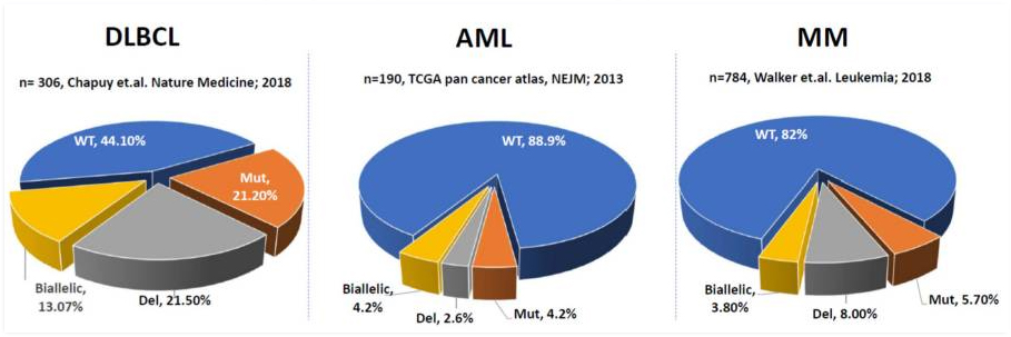 与实体瘤相比,TP53失调在血液系统恶性肿瘤中的发生率较低,例如在弥漫性大B细胞淋巴瘤(DLBCL)和AML中,约10-50%的病例发生改变TP53突变。在DLBCL中,双等位基因失活是最常见的TP53基因突变(13%),而缺失和突变各占20%。在急性髓系白血病中,TP53的改变不太常见,双等位基因失活和突变在分别占4%,缺失仅占3%。TCGA中只有一个由211例患者组成的数据集,包含SNV数据,缺乏拷贝数变异(CNV)数据,因此提供了MM中TP53单等位基因与双等位基因失活的不完整信息。佳学基因对MGP的分析表明,缺失最常见TP53基因异常,其次是突变(~6%)和双等位基因失活(~4%)(图1)。有些TP53的错义突变是功能获得(GOF)突变,并赋予P53致癌效应。有些TP53中的错义突变是功能丧失(LOF),并通过影响寡聚作用的显性负性机制发挥作用。最近的一份报告利用基因组编辑、饱和突变筛选和小鼠模型对人类髓系恶性肿瘤中的TP53热点错义突变进行了详细分析。这项分析表明,在急性髓细胞白血病中,TP53突变并不赋予新的获得性功能,而是在本质上为显性阴性,并影响该蛋白的肿瘤抑制功能。