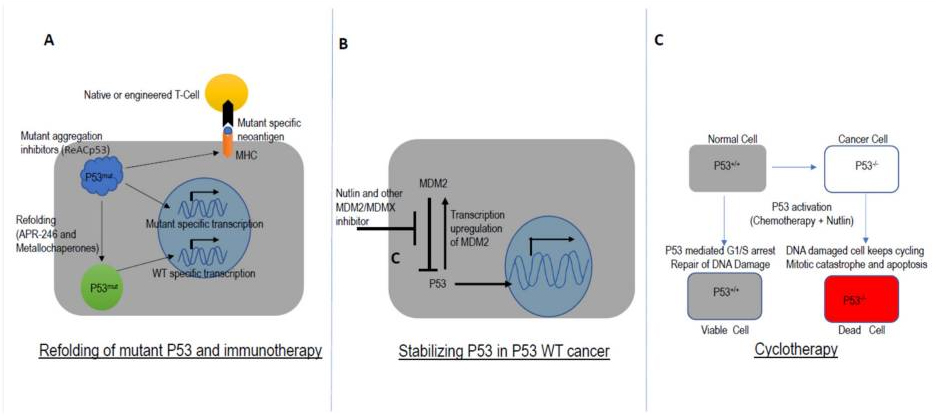 不幸的是,通过基因治疗重新引入野生型P53的尝试仍然失败。腺病毒介导的野生型P53在卵巢癌患者中的二期/三期随机试验中失败。同时,野生型P53的表达并不足以抑制所有转化细胞的生长。