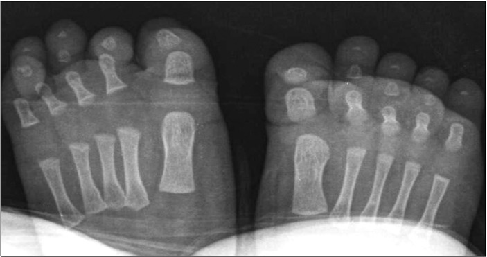 第四脚趾的弯曲先天性指甲基检测如何帮助区分症状相似的疾病: 来自重庆市市辖区江津区中山镇的倪惠君(化名)在浙江省人民医院浙江省立医院被医生诊断为第四脚趾的弯曲先天性指甲。查阅《Dermato-Endocrinology》,第四脚趾的弯曲先天性指甲的出现有多种原因,其中一个重要的原因是基因突变,这需要通过基因检测来明确。基因突变引起的可能会遗传。一名3个月大的倪惠君男孩出现了第四个脚趾甲的指甲畸形。他的左脚第四趾甲与末节指骨不平行,右脚趾甲呈弯曲状(图1A、B)。这两种情况都是出生后观察到的。他没有家族史或可疑的既往史,例如创伤。未观察到伴随的异常。双脚的放射检查显示没有骨畸形或软组织缺损(图2)。基因检测结合临床诊断他的左脚第四趾甲为先天性排列不良,右脚为先天性弯曲指甲。计划定期随访,以防止永久性畸形和并发症。先天性排列不良被定义为与远节指骨纵轴相比,甲基质水平偏移的一种情况。有一些病因假说。遗传因素、遗传和胚胎异常以及环境因素,如胎儿指甲的宫内压力,被认为是可能的致病因素。先天性排列不良通常涉及脚趾甲;然而,它可能很少涉及到其他趾甲和手指甲。尽管一半的患者表现出自发的改善,但其余患者患有严重的并发症,如嵌甲、甲状腺炎和持续性甲床营养不良。因此,对基因检测及基因信息有很好意识的医疗团队决定对患者进行定期随访,直到2岁。如果他的指甲病持续存在,则需要手术干预作为明确的治疗。个性化诊断与治疗团队发明了一种手术方法,包括甲周楔形切除和平行于末节指骨旋转楔形切除的皮瓣。最近,一种改良的手术方法被测试用于减少近端甲襞损伤。先天性第四足趾弯曲指甲的特征是足底弯曲甲盖,平行于远端指骨的纵轴。实际上,这是由先天性发育不全或远端指骨4缺失引起的继发性指甲畸形。然而,与病例类似,一些没有潜在骨或软组织缺陷的病例也已报道。除了第四趾甲外,还没有发表先天性弯曲指甲的病例报道。因此,它被称为先天性第四趾弯曲指甲。然而,最近遇到了一例先天性弯曲指甲,涉及双侧第二、第三和第四趾甲;虽然它还没有向同行展示。据认为,先天性弯曲指甲也可以在除第四指甲以外的其他趾甲中出现。另一方面,其他指甲和脚趾甲疾病并不伴有先天性弯曲指甲,因为它被认为是中胚层缺陷,而不是外胚层缺陷。由于骨骼或软组织的潜在缺陷,确定的治疗非常困难。因此,建议保守治疗,如避免外伤,以缓解甲松解和进一步的指甲营养不良。由于先天性趾甲排列不良和第四趾甲先天性弯曲指甲的发病率较低,本报告具有重要意义。此外,它还介绍了第一例在一名患者中同时出现这两种指甲疾病的病例。