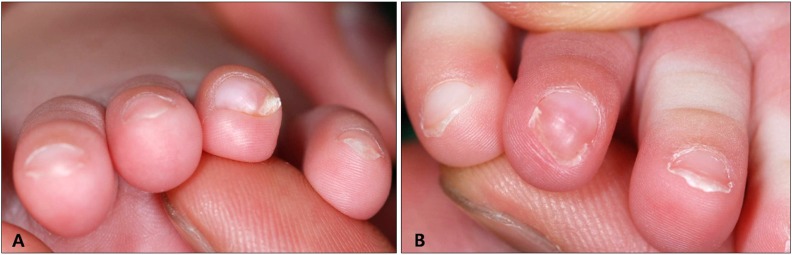 图1:(A) 左第四趾甲侧向偏斜,无任何并发症。(B) 右第四脚趾的指甲向后弯曲。