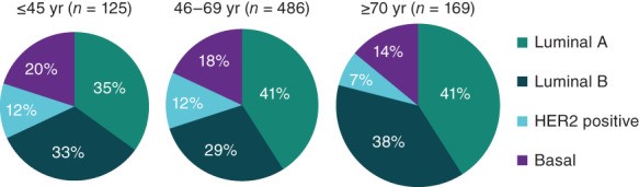 最近,研究人员分析了来自癌症基因组图谱 (TCGA) 数据集的 780 名早期乳腺癌患者体细胞突变的年龄相关差异。基因表达谱显示不同年龄组(≤45、46-69 和 ≥70 岁)的亚型分布相似;然而,年轻患者患三阴性(基底)肿瘤的可能性更大(图 1)。对来自癌症后生活流行病学和途径研究的 1,319 名参与者的样本进行类似分析发现,对于年龄 << 40 岁和 1.27(95% CI:0.72-2.27)对于 40-49 岁的人来说,在患有其他低风险 HR+ 疾病的女性中,有一种更具侵袭性的变异趋势。此外,基因表达谱表明,与老年患者的肿瘤相比,年轻(≤40 岁)患者的管腔 B 肿瘤更具侵袭性。