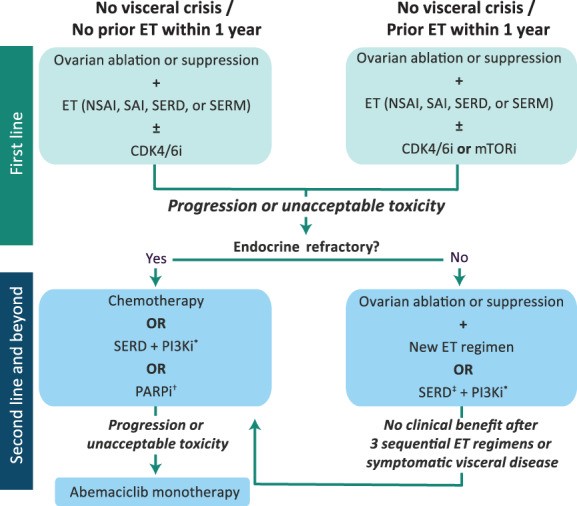 图2:激素受体阳性/人表皮生长受体 2 阴性 mBC 绝经前妇女的治疗流程。*在美国食品和药物管理局批准的测试中检测到PIK3CA突变的患者中。†在有种系BRCA1/2突变的患者中。‡如果第一行没有收到。缩写:CDK4/6i,细胞周期蛋白依赖性激酶 4/6 抑制剂(palbociclib、ribociclib、abemaciclib);ET,内分泌治疗;mTORi,雷帕霉素抑制剂(依维莫司)的哺乳动物靶点;NSAI,非甾体可逆芳香酶抑制剂(阿那曲唑、来曲唑);PARPi,聚 ADP 核糖聚合酶抑制剂(olaparib,talazoparib);PI3Ki,磷脂酰肌醇-3-激酶抑制剂(alpelisib);SAI,甾体不可逆芳香酶灭活剂(依西美坦);SERD,选择性雌激素受体降解剂(氟维司群);SERM,选择性雌激素受体调节剂(他莫昔芬、托瑞米芬)。Oncologist. 2020 Jun; 25(6): e900–e908.