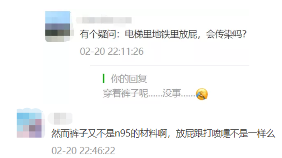 1. 正常穿着裤子的情况下,放屁是不会传播新冠病毒的!通过放屁传染新冠病毒需要满足两个基本条件: