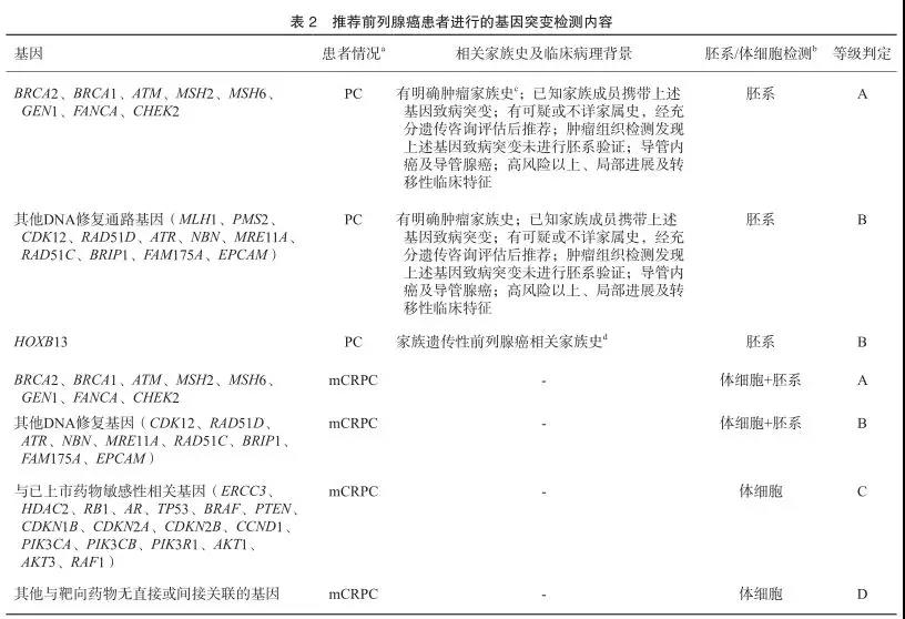 对于所有转移性去势抵抗性前列腺癌(metastatic castration-resistant prostate cancer,mCRPC)患者,推荐进行至少包含DNA修复基因胚系及体细胞变异的检测。